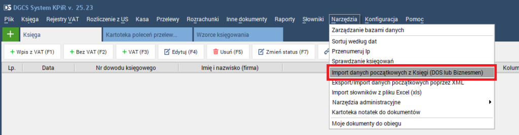 - Uruchomić program i  wybrać Narzędzia → Import danych początkowych z Księgi (DOS lub Biznesmen).
