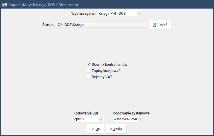 - W oknie Import danych księgi DOS i Biznesmen, w polu Ścieżka podaj katalog Księga. W podanym przykładzie zostanie zaimportowany słownik kontrahentów, jeżeli mają zostać zaimportowane również zapisy należy zaznaczyć pozostałe dwa parametry: Zapisy księgowań oraz Rejestry VAT.