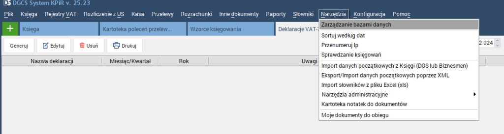 Jeżeli w programie DOS odbywała się praca na wielu księgach w celu założenia kolejnego klienta należy w programie DGCS System przejść do opcji Narzędzia → Zarządzanie bazami danych.