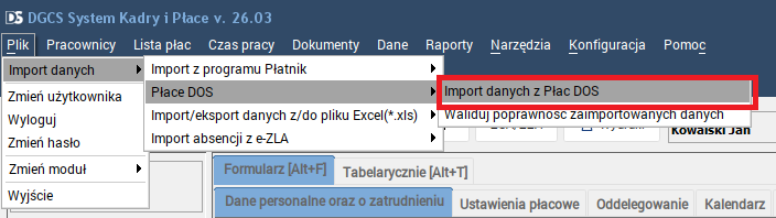 3. Uruchomić program i  wybrać Plik → Import danych → Płace DOS →Import danych z Płac DOS