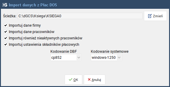1. W oknie Import danych z Płac DOS, w polu Ścieżka podaj katalog Księgi w której znajdują się dane pracowników w przypadku wieloksięgi np. KSIEGA0 w przypadku firmy należy wskazać główny katalog Ksiega. W podanym przykładzie zostaną zaimportowane dane firmy, dane pracowników z pracownikami nieaktywnymi oraz ustawienia składników płacowych.